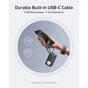 - Tartós beépített USB-C kábel: A 21,5 cm hosszú, beépített USB-C kábel rendkívül strapabíró, akár 10 000 hajlítási ciklust és 5 kg (11 font) húzást is kibír, így nem kell aggódnia a kopás miatt.