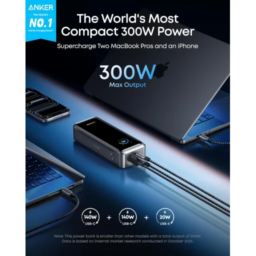 - Hatalmas 300W-os kimenet: Ez a világ legkompaktabb 300W-os powerbankja, amely könnyedén feltölt két MacBook Pro-t és egy iPhone-t egyszerre. A 2 USB-C porton keresztül akár 140W-os, az USB-A porton keresztül pedig 20W-os töltési sebességet érhetsz el.