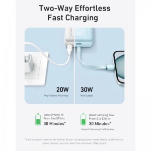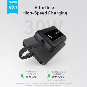 Élvezze az ultra-gyors töltést készülékeihez. A 30W-os Power Delivery (PD) és Quick Charge (QC) technológiának köszönhetően az Anker Zolo hihetetlen sebességgel tölti fel eszközeit. Képes egy iPhone 15-öt 0%-ról 57%-ra, egy Samsung S24-et 0%-ról 53%-ra feltölteni mindössze 30 perc alatt. Sőt, egy iPhone 16 Pro Max készülék 50%-ra tölthető 27 perc alatt, ami kétszer gyorsabb, mint egy hagyományos 15W-os powerbank. A powerbank támogatja a Samsung gyorstöltési funkcióját is.