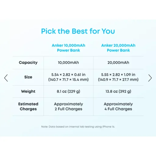 - Hordozható és kényelmes: A power bank méretei (140.9 x 71.7 x 27.7 mm) és súlya (392 g) ellenére hihetetlenül nagy teljesítményt nyújt. Súlya nagyjából két iPhone 16 Pro telefon súlyának felel meg.
