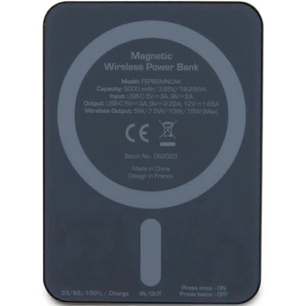 Az eszköz egy USB-C porttal van ellátva, amely egyaránt szolgál a készülékek töltésére és a power bank töltésére szolgáló bemenetként. A csomag tartalmaz egy USB-C kábelt, amely lehetővé teszi mind a telefon, mind a powerbank töltését. A termék Guess márkanév alatt készült.