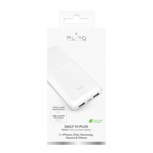 Powerbank Puro DAILY 10 PLUS 10000mAh 2x USB-A / 1x USB-C 22.5W PD AFC - fehér A Puro DAILY 10 PLUS powerbank 10000mAh kapacitással tökéletes megoldás számodra! Három kimenettel felszerelve (2x USB-A és 1x USB-C) lehetővé teszi több eszköz egyidejű töltését. A 22.5W maximális teljesítmény és a PD valamint AFC protokollok támogatása gyors és hatékony töltést biztosít. A tűzálló anyagokból készült szilárd konstrukció biztonságos használatot garantál. Próbáld ki még ma és élvezd a megszakítás nélküli energiát útközben, a munkában és minden nap.