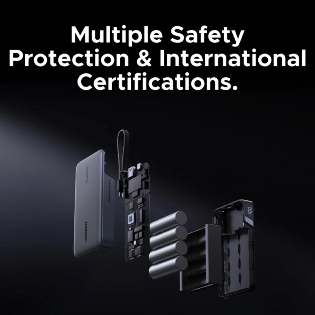 Az UGREEN PB550 nem csak gyors, hanem biztonságos is. Számos beépített biztonsági védelemmel és nemzetközi tanúsítvánnyal rendelkezik, amelyek megóvják eszközeit a túltöltéstől, túlmelegedéstől és rövidzárlattól, garantálva a gondtalan használatot.