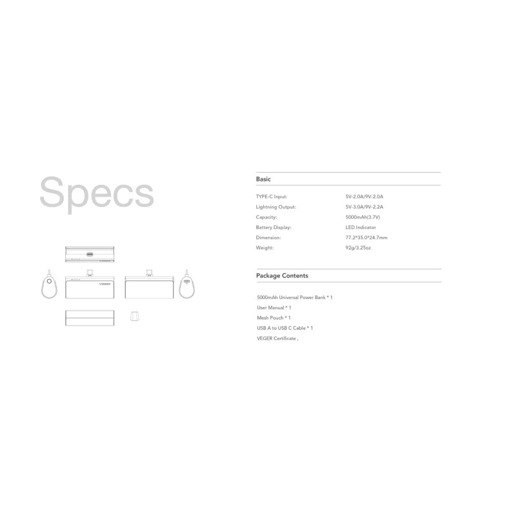 Nem csak Lightning csatlakozós eszközöket tölthetsz vele! Bár a beépített Lightning port az iPhone és iPad felhasználók álma, a powerbank rendelkezik USB-C bemenettel is a saját töltéséhez, így könnyedén feltöltheted otthon vagy útközben. Tartós műanyag borítása biztosítja a hosszú élettartamot, míg a VEGER márkanév a minőséget és megbízhatóságot garantálja. Tökéletes választás utazáshoz, kiránduláshoz, munkahelyre, vagy egyszerűen csak a mindennapi biztonsági energiatartalékként.