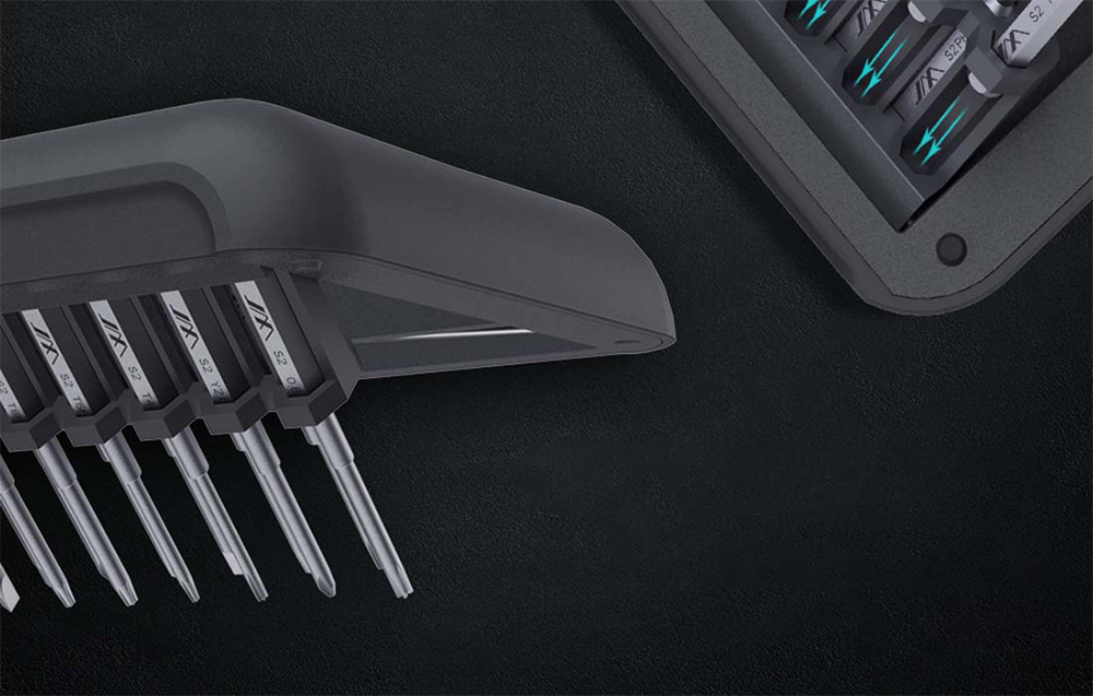 A mágneses adszorpciónak köszönhetően a bitek stabilan ülnek a tartóban. Ez azt jelenti, hogy nem kell aggódnia az egész szerkezet stabilitása miatt. Ezenkívül a tokon található gombok kinyomják a bitek paneljeit a foglalatukból, és megdöntik őket a könnyebb hozzáférés érdekében. Ezt segíti a mágnesesítő és demágnesítő funkció. A felhasználói biztonság és az eszközei, valamint készülékei sérülésmentes megőrzése számunkra abszolút prioritás!