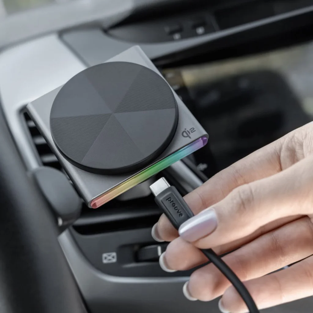 Proove - Autós tartó vezeték nélküli töltéssel Neostorm (WHNS15002003) - légkondicionáló szellőzőhöz, mágneses, Qi2, 15W, RGB, alumínium - szürke