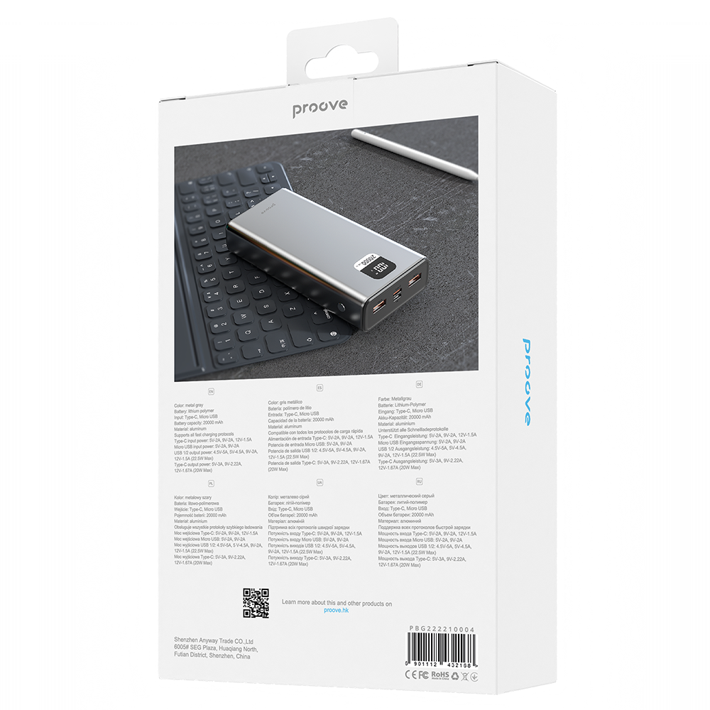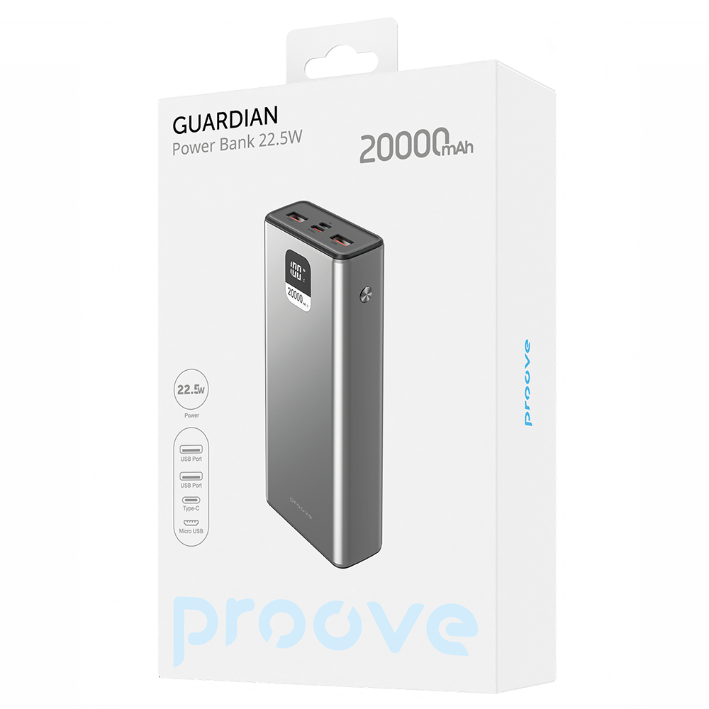 A erős és kompakt Proove Guardian 22.5W tökéletes társ utazáshoz és napi használathoz. A 20,000 mAh kapacitással többször is feltöltheti eszközeit, élvezve a megszakítás nélküli kapcsolatot. A 22.5W gyorstöltési technológia lehetővé teszi, hogy gyorsan feltöltse az energiát okostelefonokban, táblagépekben és más kütyükben. Az fémes szürke borítás modern és elegáns megjelenést kölcsönöz, míg a szilárd felépítés tartósságot biztosít. A Proove Guardian megbízhatóság, stílus és teljesítmény, amire számíthat!