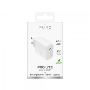 A Puro PROLITE 45W USB-C Falitöltő - Fehér hálózati töltő azok számára tökéletes megoldás, akik értékelik a kényelmet és a megbízhatóságot. Kompakt méretének és könnyű kialakításának köszönhetően ideális utazáshoz. A modern, stílusos fehér dizájn bármely belső térhez és elektronikai eszközhöz tökéletesen illik. A készülék gyors és biztonságos töltést biztosít, és az áramköri védelem megakadályozza a rövidzárlatokat. Magas minőségű, tűzálló anyagokból készült, hosszú távú tartósságot és biztonságot garantál. Egy megbízható kiegészítő, amely még a legigényesebb felhasználók elvárásainak is megfelel.