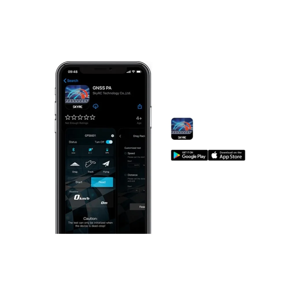 Az ingyenes GNSS PA alkalmazás lehetővé teszi, hogy az eszköz sebességét távolról kövesse iOS vagy Android telefonján. A beépített Bluetooth 4.0 lehetővé teszi a valós idejű adatok követését. Három mód: Drag, Track és Flying, amelyek segítségével könnyedén elemezheti autózási vagy repülési útvonalait.