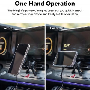 A MagSafe-kompatibilis mágneses alapnak köszönhetően telefonja egyetlen kézzel gyorsan rögzíthető és eltávolítható, valamint szabadon beállítható a kívánt álló vagy fekvő orientációba. Az autós légbefúvó rácsra rögzíthető kialakítás stabil és biztonságos tartást biztosít.
