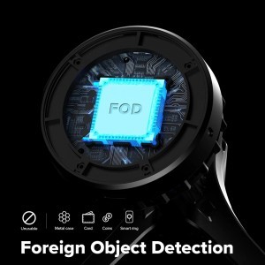 A beépített Foreign Object Detection (FOD) rendszer megbízhatóan észleli az idegen fémtárgyakat (például fém tokokat, érméket, kártyákat, okosgyűrűket) a töltőfelületen, és megakadályozza a töltés megkezdését, ezzel óvva készülékét és az autót a potenciális károktól.
