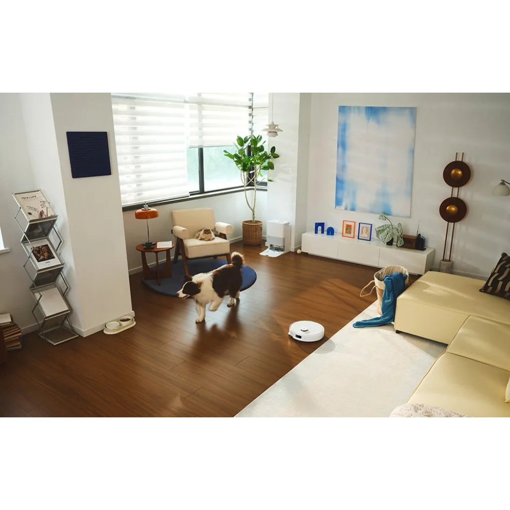 A fejlett Reactive AI rendszer, amelyet RGB kamera és strukturált fénytechnológia támogat, lehetővé teszi az akadályok pontos felismerését és hatékony kikerülését. A robot még az olyan apró tárgyakat is felismeri, mint a vezetékek, apró tárgyak vagy állattartó tálak, így biztonságosan és zökkenőmentesen mozoghat a helyiségben. A készülék háziállat-felismerő funkcióval is fel van szerelve, ami kényelmes munkavégzést biztosít a háziállatok közelében. Emellett az optimalizált kialakításnak köszönhetően a robot rendkívül halkan működik (55 dB), anélkül, hogy zavarná a mindennapi tevékenységeket. A beépített Video Call funkció lehetővé teszi, hogy távolról is megtekinthesse környezetét, és valós időben interakcióba léphessen háziállatával.