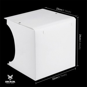 A Jackal PB206 mini fotósátorban könnyedén fotózhatunk kisebb méretű tárgyakat. Az áramforrást USB porton kapja, aminek a kábele megtalálható a csomagban. A két LED sor megfelelő fényerőt biztosítás a tárgyfotózáshoz. Adapterrel, számítógépről, powerbankról, bármilyen USB-s eszközről. LED soronként 5V 1A a minimum áramigénye. Az fotódoboz összeszerelése pár másodperc csak, hiszen az oldalfalak könnyedén összepattintva azonnali tartást biztosítanak.