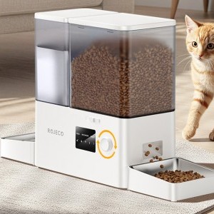 A Rojeco Button Version 2 az 1-ben szökőkút és ételadagoló egy minden egyben megoldás a macskák és a kis és közepes méretű kutyák tulajdonosai számára a friss víz és a pontosan adagolt ételek biztosítására. A víz és a szárazeledel számára elkülönített tartályokkal az eledel friss marad, és nem keveredik a vízzel, növelve kedvence kényelmét az étkezések során. A szifon elvén alapuló automatikus vízutántöltő rendszer azt jelenti, hogy a háziállat mindig tiszta vízhez jut, anélkül, hogy naponta újra kellene tölteni. További előnye ennek a modellnek, hogy az etetést a mobilalkalmazásból is vezérelheti, ami még nagyobb kontrollt és kényelmet biztosít.