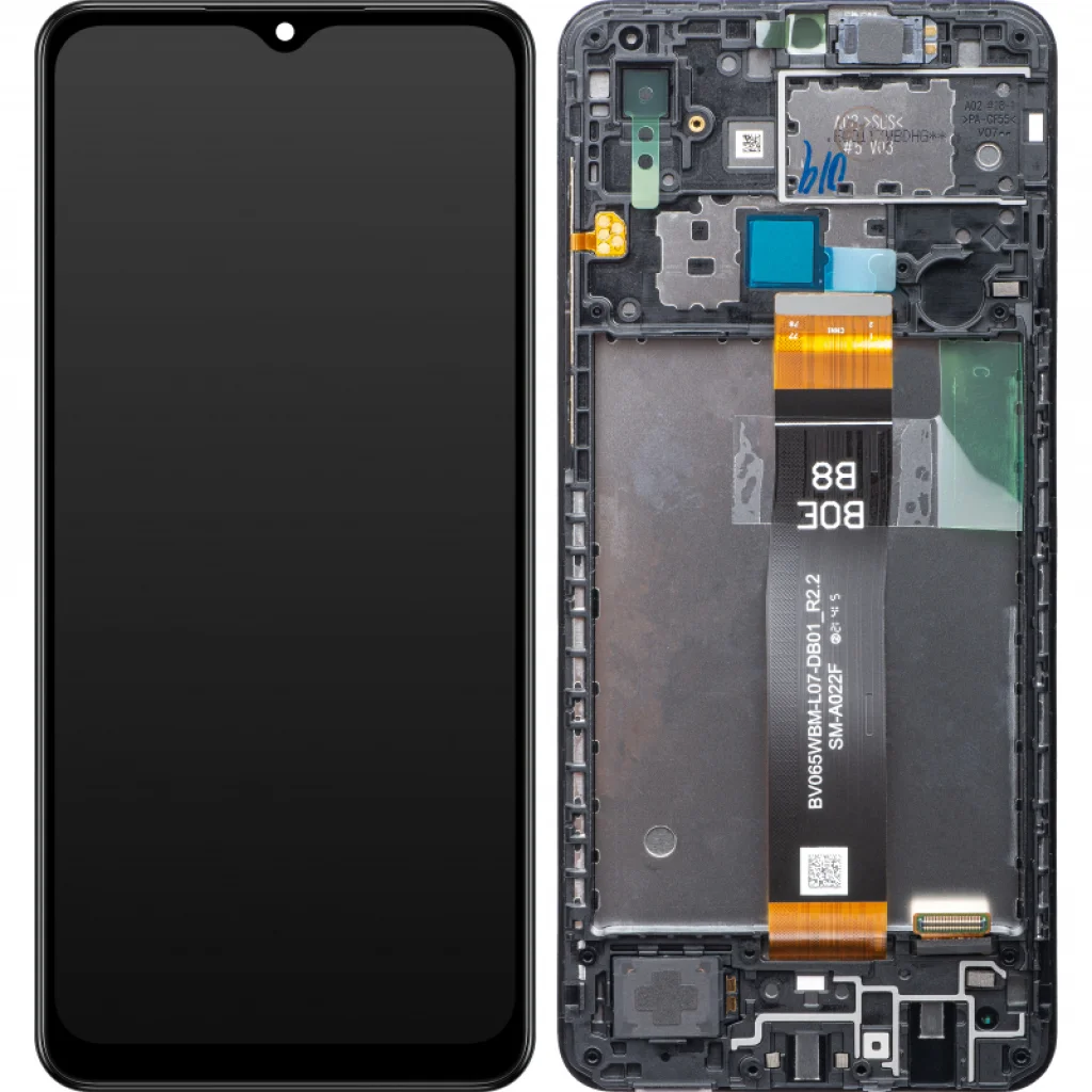 LCD kijelző modul + akkumulátor Galaxy A02 A022 LCD kijelző, amely tartalmazza az érintőpanelt/digitizert és a keret összeállítást - eredeti szervizalkatrész. Ha a képernyője repedt, karcos, vagy vannak megdöglött pixelek, vonalak vagy vízkárok, akkor ez a termék segít Önnek. Ezzel az egységgel kicserélheti a Samsung A02 (SM-A022F, SM-A022F/DS, SM-A022M, SM-A022M/DS, SM-A022G, SM-A022G/DS) teljes elülső fedelét, beleértve a keretet, az üveget, az érintőképernyőt, az LCD kijelzőt, a zümmögőt, a hangszórót, az oldalsó gombok mikrokapcsolóit.