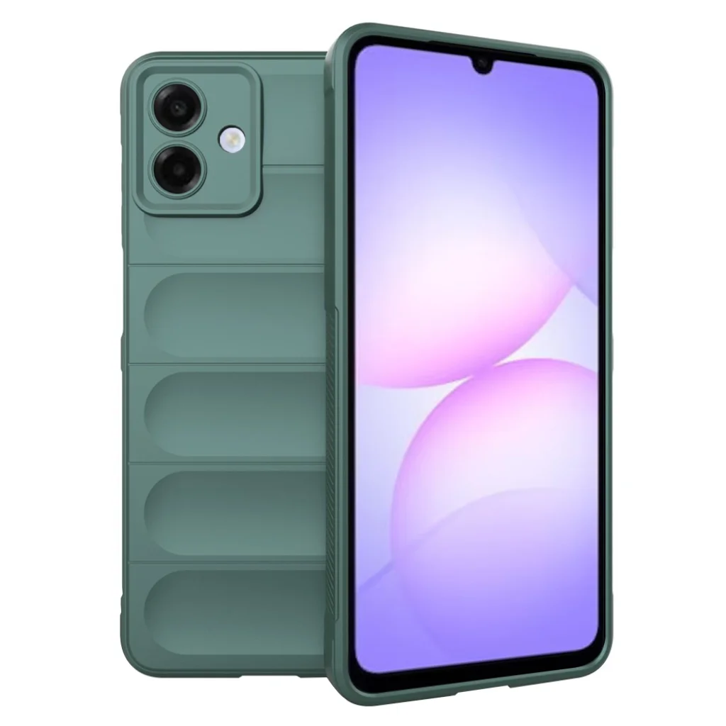 A mélyzöld árnyalat elegáns és időtálló megjelenést biztosít, amely harmonikusan illeszkedik a Samsung Galaxy A07 4G modern vonalaihoz. A tok hátlapján futó egyedi, hullámos bordázat nemcsak látványos, hanem kulcsfontosságú a készülék biztonságos fogásában. Az oldalsó részek textúrája tovább erősíti ezt a hatást, így a telefon kevésbé valószínű, hogy kicsúszik a kezéből, még nedves körülmények között is.