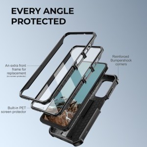 - Beépített képernyővédő: A tokhoz tartozó beépített PET képernyővédő gondoskodik a kijelző karcmentességéről és védelméről. A csomag tartalmaz egy extra előlapi keretet is a cseréhez, ha képernyővédő nélkül szeretné használni, vagy ha a beépített védő megsérül.