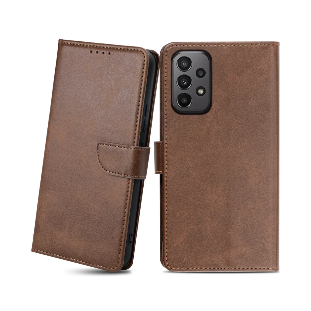 Samsung Galaxy A23 5G mágneses PU bőr fliptok kártyatartóval sötétbarna Alphajack