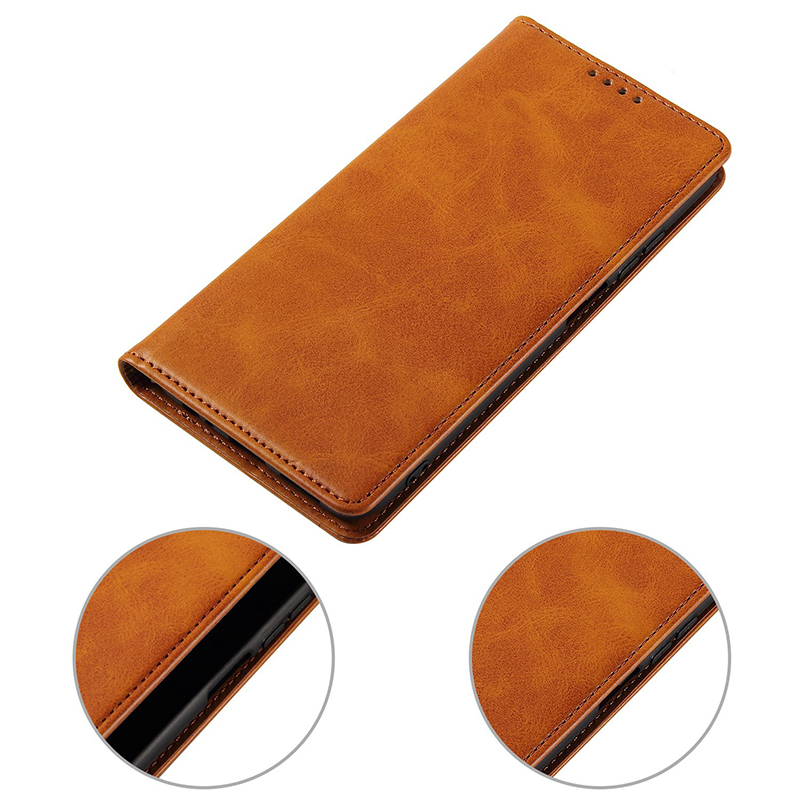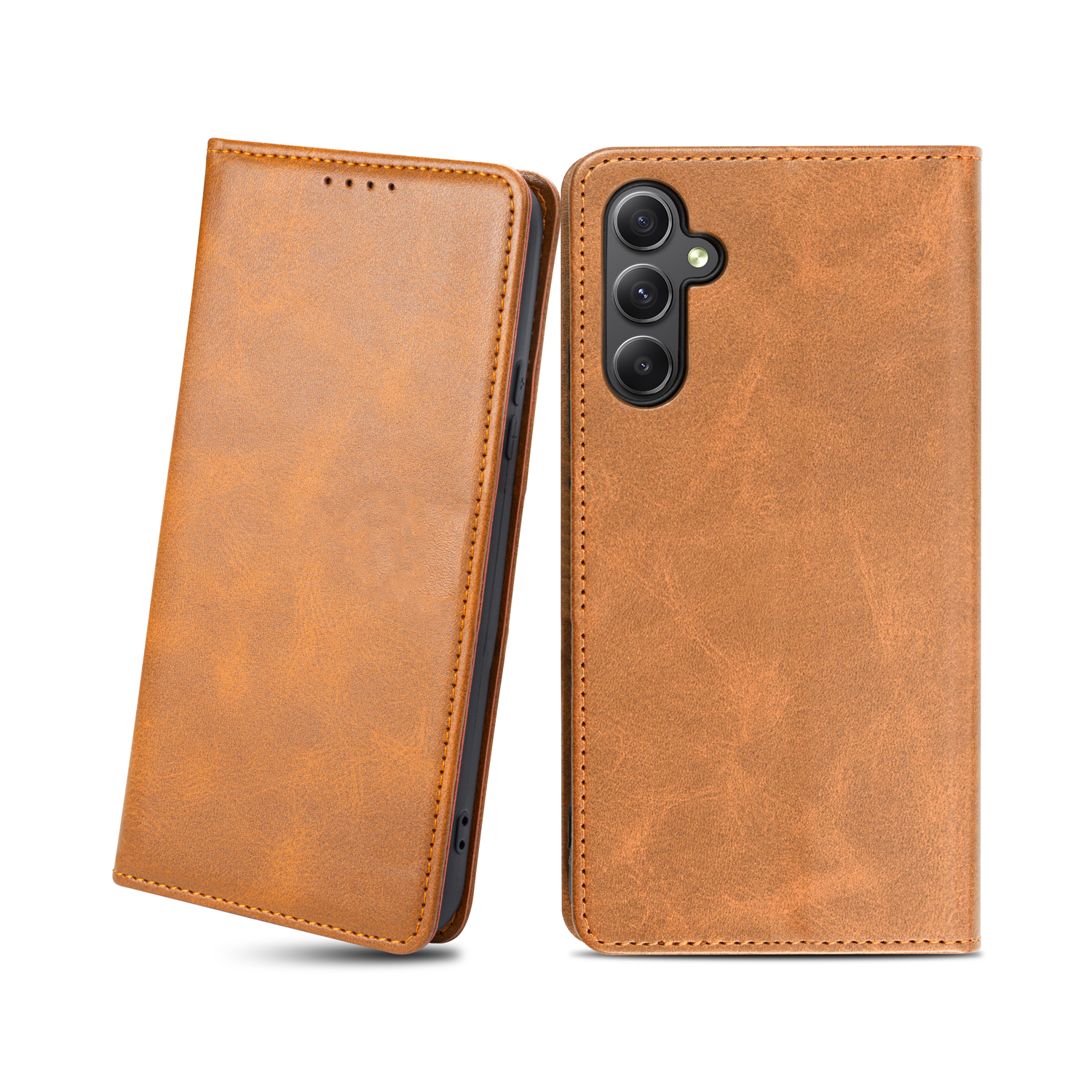 Samsung Galaxy A34 5G mágneses pánt nélküli PU bőr fliptok kártyatartóval világosbarna Alphajack