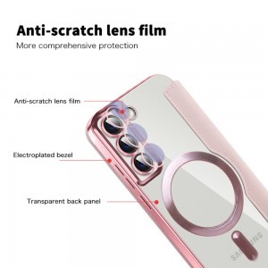 Ez a Techsuit könyv tok a rózsaszín eleganciáját ötvözi a modern funkcionalitással. A külső felület kiváló minőségű szintetikus bőrből készült, amely kellemes tapintású és tartós, míg a belső rész puha mikroszálakkal bélelt, hogy megóvja készüléke kijelzőjét a karcolásoktól. Az átlátszó hátlap lehetővé teszi, hogy telefonja eredeti színe és dizájnja érvényesüljön, amelyet egy finoman galvanizált, rózsaszín keret emel ki, garantálva a prémium megjelenést és az extra védelmet.