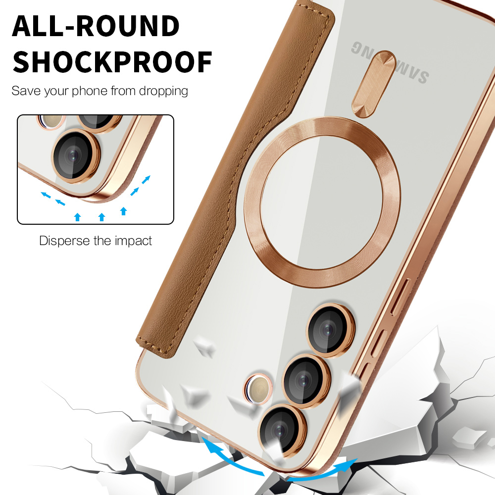 - Elegáns design és prémium anyagok: A tok külső része minőségi szintetikus bőrből készült, kellemes tapintású és tartós. Belső oldala puha mikroszálas anyaggal bélelt, amely óvja a telefon kijelzőjét a karcolásoktól. Az áttetsző hátlap és a rose gold színű galvanizált keret elegánsan kiemeli a Samsung Galaxy S23 Plus eredeti designját.