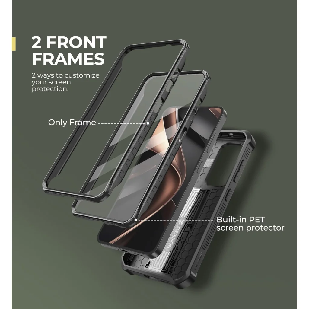 Kétféle képernyővédelem: A Dexnor tokkal Ön választhatja meg, hogyan védi képernyőjét. A csomag két előlapot tartalmaz: az egyik beépített, karcálló PET képernyővédővel rendelkezik, amely támogatja a Touch ID-t is; a másik előlap képernyővédő nélkül használható, így tökéletesen kompatibilis a saját edzett üvegfóliájával. A megemelt élek mindkét esetben távol tartják a képernyőt a karcolásoktól és az esésektől.