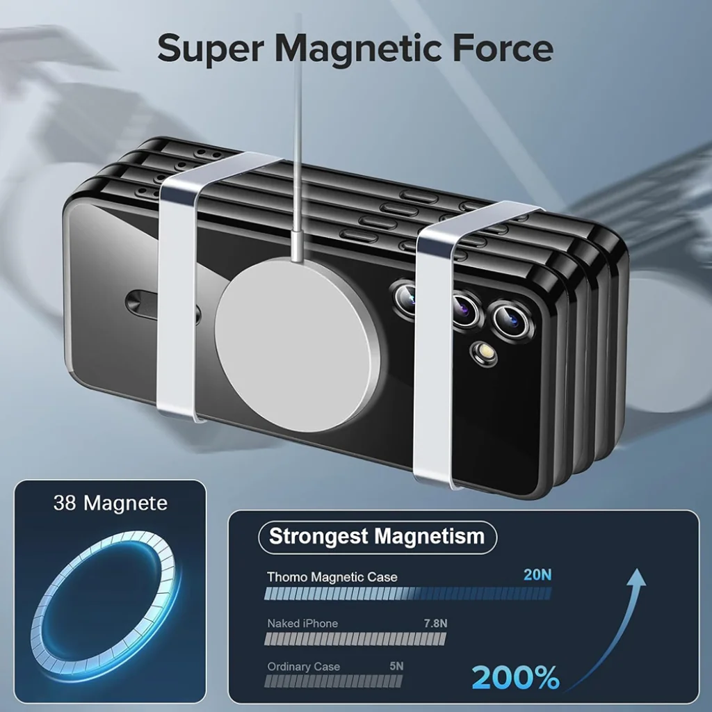 - Szuper mágneses erő: Felejtse el a gyenge tartást! A beépített 38 db erős mágnesnek köszönhetően ez a tok kivételes MagSafe kompatibilitást és tartást biztosít. A 20N mágneses erő 200%-kal erősebb az átlagos tokoknál (5N), garantálva, hogy MagSafe tartozékai stabilan a helyükön maradjanak. Akár több telefont is egymásra rakhat a mágneses tartásnak köszönhetően.