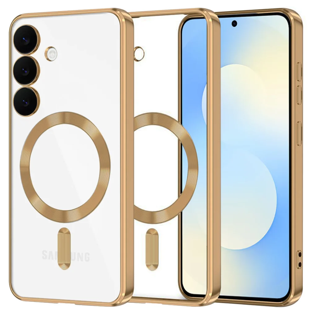 - Luxus megjelenés: Az átlátszó, kristálytiszta hátlap tökéletesen láttatja a Samsung Galaxy S25 FE eredeti színét és logóját, míg az elegáns arany színű keret prémium érzetet kölcsönöz. A kamera kivágások és a MagSafe gyűrű szintén arany színűek, harmonikus összhangot teremtve.