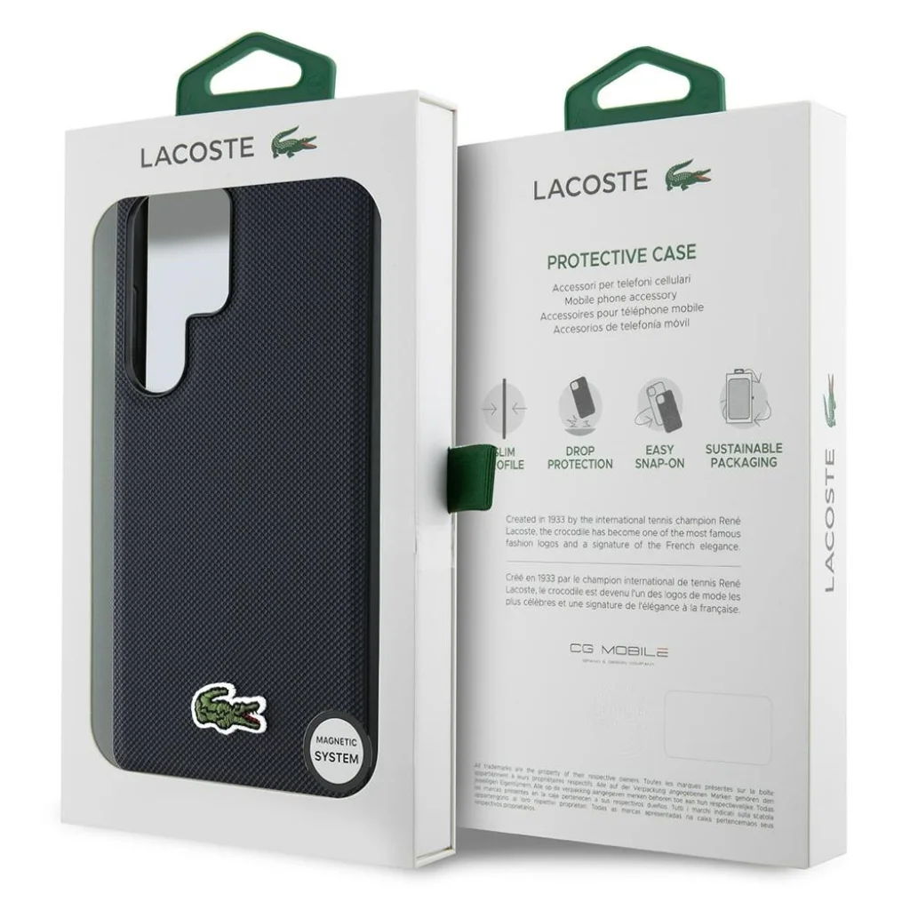A tok érdekes textúrával rendelkezik, ami nemcsak vonzza a szemet, hanem kellemes tapintási élményt is nyújt. A finom felületi kidolgozás miatt a tok nemcsak esztétikus, hanem funkcionális is, biztos fogást és kényelmet nyújt a használat során. A kollekciót az ikonikus krokodil képe díszíti, amely tökéletesen visszaadja a Lacoste márka szellemét, egyesítve az eleganciát a sportos stílussal.