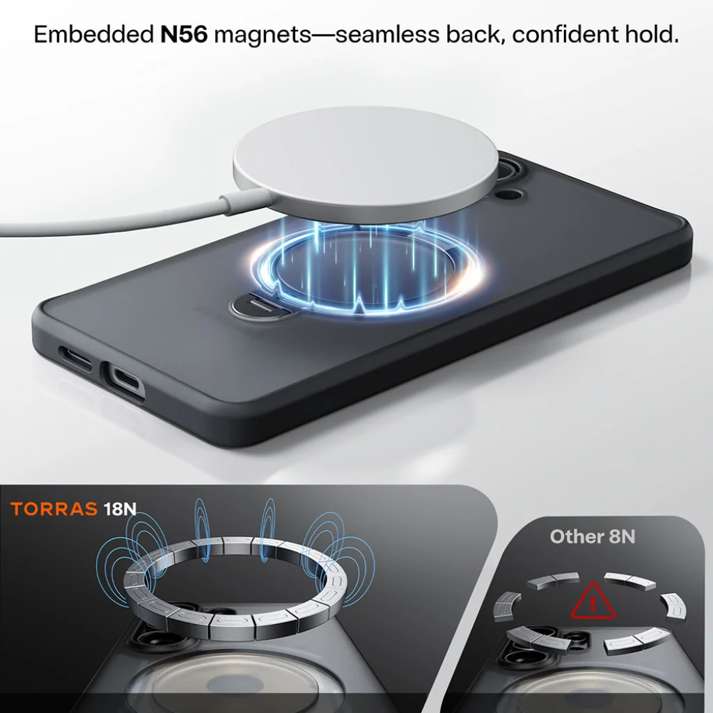A Torras Ostand Q3 Spin tok beépített N56 mágnesekkel rendelkezik, amelyek biztosítják a zökkenőmentes és erős mágneses rögzítést MagSafe kompatibilis kiegészítőkkel és vezeték nélküli töltőkkel. A 18N mágneses erő (szemben más tokok átlagos 8N erejével) garantálja a stabil és magabiztos tartást, legyen szó autós tartóról vagy power bankról.
