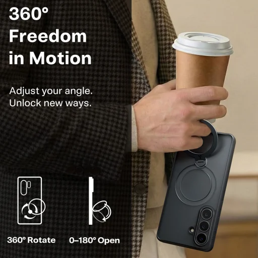 - 360° fokos szabadság: A gyűrű 360°-ban elforgatható és 0-180° között nyitható, lehetővé téve, hogy pillanatok alatt beállítsa a tökéletes látószöget álló vagy fekvő módban. Dolgozhat, filmezhet vagy videóhívásokat bonyolíthat le profi módon, anélkül, hogy a telefont a kezében kellene tartania.