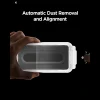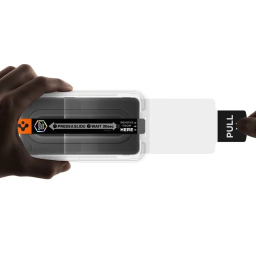- A szerelőkeretet mindkét oldalon tartva húzza meg a kezdőfóliát (a „PULL” jelölésű fület), hogy elindítsa a védőüveg automatikus felragasztását a kijelzőre.