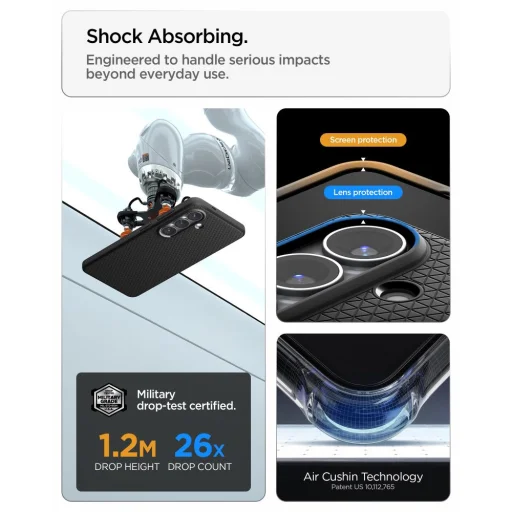 A tok teljes egészében strapabíró és rendkívül rugalmas TPU (termoplasztikus poliuretán) anyagból készült, mely ellenáll az ütéseknek és a karcolásoknak. A sarkokban alkalmazott Air Cushion technológia légtereket hoz létre, amelyek hatékonyan elnyelik az ütéseket esés során. A tok katonai szabványoknak megfelelően tanúsított (Military drop-test certified), akár 1.2 méteres magasságból 26 alkalommal leejtve is bizonyította ütésállóságát. A képernyő és a kamera körüli megemelt peremek extra védelmet nyújtanak a karcolásokkal szemben, amikor a telefon sík felületen fekszik.