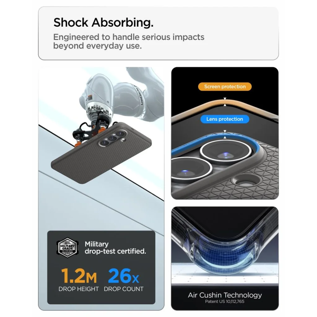 • Katonai szintű ütéselnyelés: A Spigen szabadalmaztatott Air Cushion Technology® technológiája a sarkokban légpárnákat hoz létre, melyek hatékonyan elnyelik az ütéseket és eséseket. A tok katonai szabványú (MIL-STD 810G-516.6) ejtésteszten is átesett, igazolva, hogy 1.2 méterről, 26 alkalommal leejtve is megvédi a telefont a mindennapi igénybevételen túl.