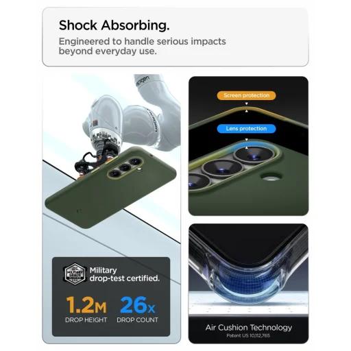 • A sarkokban alkalmazott Air Cushion technológia légterekkel csillapítja az ütések erejét. Ez a megoldás katonai ejtési teszten tanúsított (MIL-STD 810G-516.6), 1.2 méterről 26-szor elejtve is megvédi a telefont.