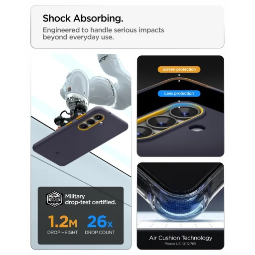 • Air Cushion technológia: A sarkokban található légpárnák extra védelmet nyújtanak az ütésekkel szemben, elnyelve az energiát esés esetén. Ez a technológia katonai szintű, 1.2 méteres magasságból, 26 alkalommal történő leejtési teszten is bizonyított.