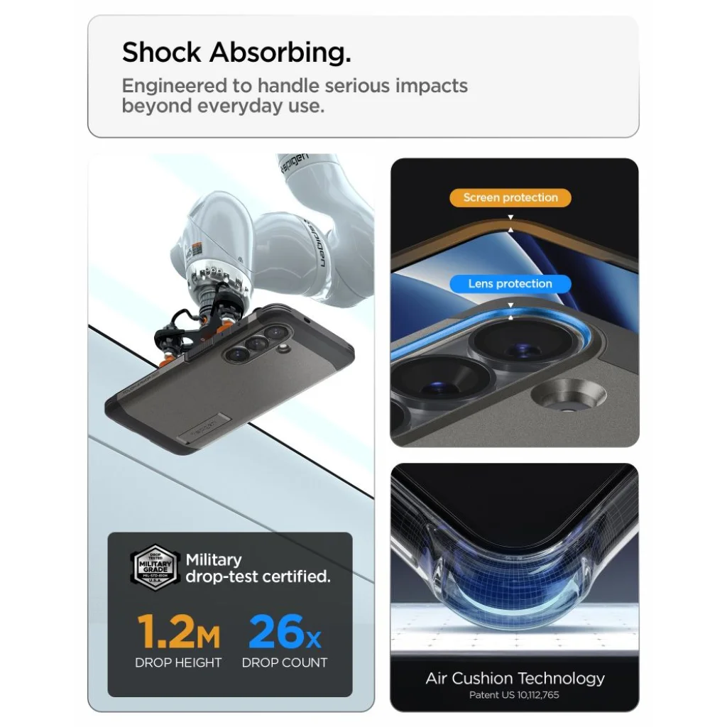 Ez a tok egyedülálló, többrétegű szerkezettel rendelkezik, amely a tartós polikarbonát (PC) külső réteget rugalmas TPU belsővel és speciális ütéselnyelő habbal (Extreme Impact Foam) ötvözi. Ez a kombináció biztosítja a maximális védelmet az esésekkel, ütközésekkel és karcolásokkal szemben. A Spigen szabadalmaztatott Air Cushion technológiája a sarkokban elnyeli az ütéseket, míg a belső technológiai habréteg (Extreme Impact Foam) akár 90%-os ütéscsillapítást nyújt, így a telefon a legextrémebb kihívásoknak is ellenáll.