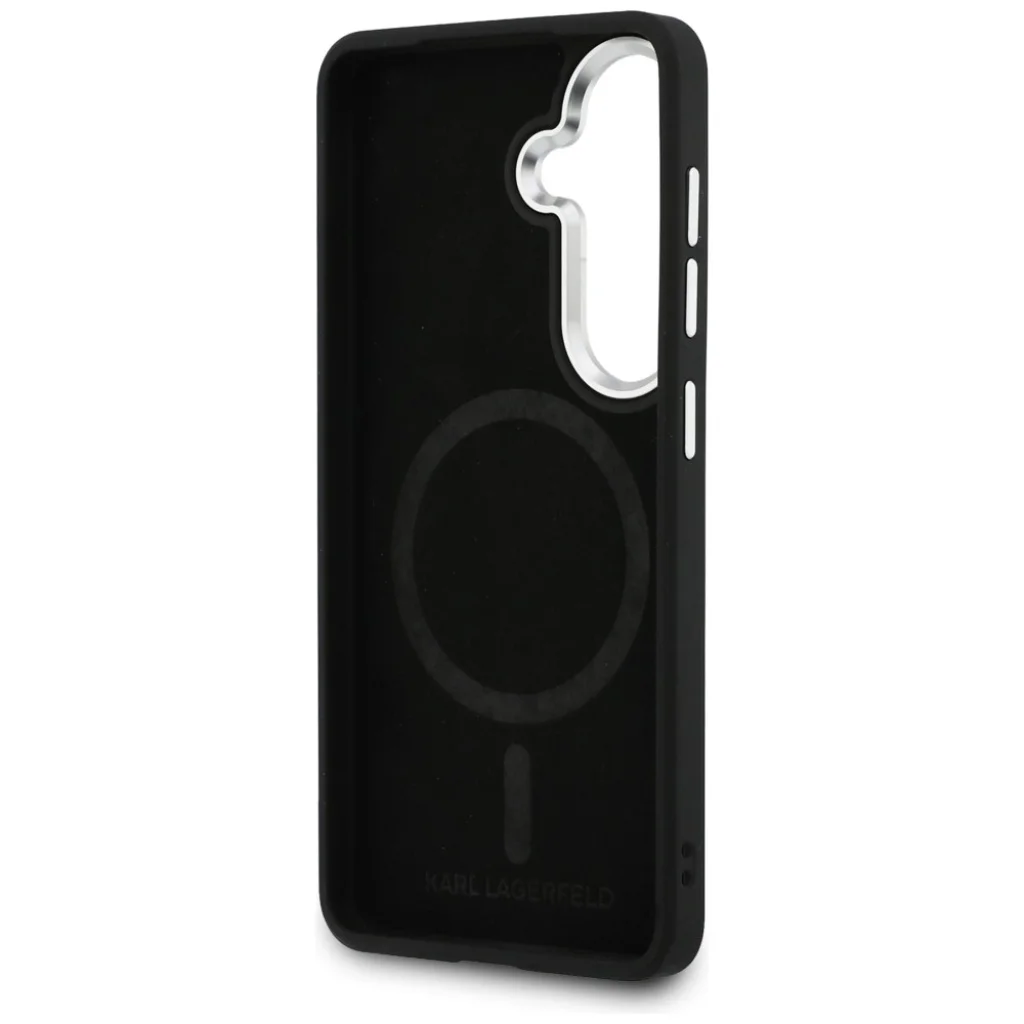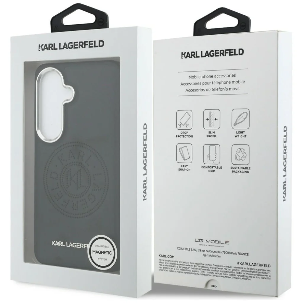 Egyedi megjelenés és kiváló minőség. Az exkluzív védőtok a neves Karl Lagerfeld márkától eleganciát és felső szintű stílust kombinál. A tok magas minőségű ökobőrből készült. A hátoldalán egy jellegzetes, kerek formájú dombornyomott KL logó található, míg az alsó részen egy finom ezüst Karl Lagerfeld logó díszíti. A fémkeret a kamera körül és az ezüst oldalsó gombok luxus érzetet adnak a teljes dizájnnak. A tok MagSafe gyűrűvel van felszerelve, ami tökéletes kompatibilitást biztosít a mágneses kiegészítőkkel. Ez az ideális kombinációja a funkcionalitásnak és az elegáns dizájnnak, így a telefon nemcsak tökéletesen védett, hanem divatos kiegészítő is.