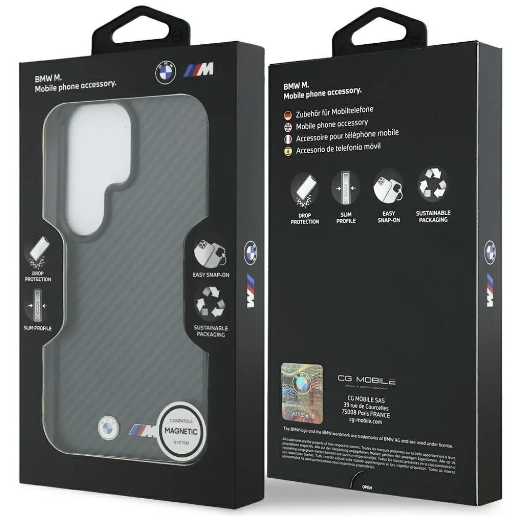 Az exkluzív BMW tok az M Kevlar Logo MagSafe kollekcióból prémium minőségű borítás, amelyet a világ egyik legnépszerűbb autógyártója engedélyezett. Tökéletes választás minden MagSafe technológiával rendelkező készüléktulajdonos számára. Az egyedi dizájn és kiváló minőség ötvözete. A BMW M Kevlar Logo MagSafe tok sportos karaktert és maximális tartósságot kínál. Az aramid szálból készült felület jellegzetes karbonszálas textúrát biztosít, és ellenáll a mindennapi használatnak. A design a BMW logóval van befejezve, amely kiemeli a termék presztízsét és eredetiségét. A kamera keretének és gomboknak fekete színe elegáns és koherens megjelenést kölcsönöz a tok számára. Karcsú profiljának és gondos kidolgozásának köszönhetően modern és stílusos megjelenést biztosít. A tok rugalmas szélei lehetővé teszik a gyors telepítést és eltávolítást. Karcsú kialakítása nem növeli jelentősen a telefon méreteit, ugyanakkor védelmet nyújt leejtés ellen. Az enyhén megemelt élek a képernyő és a kamera körül további védelmet nyújtanak a karcolások ellen. A tok precíz kivágásokkal és gombfedelekkel rendelkezik, biztosítva, hogy a telefon használata teljes mértékben kényelmes maradjon. A tok mágneses gyűrűvel van felszerelve, amely kompatibilis a MagSafe vezeték nélküli töltővel, gyors és egyszerű töltést biztosítva. A tok beépített mágnesekkel rendelkezik, amelyek tökéletesen igazodnak a telefonhoz, és biztosítják az erős kapcsolódást a MagSafe töltőhöz. A tok a BMW licenc alapján készült.