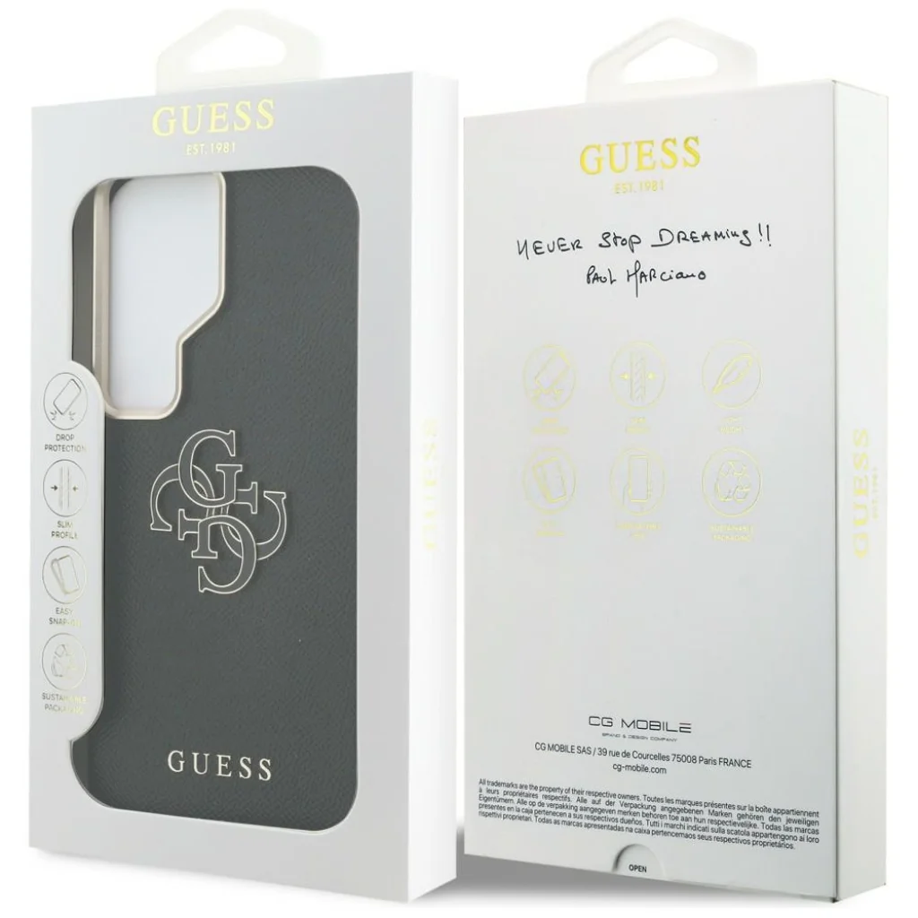A tok kiváló minőségű öko-bőrből készült, texturált felülettel, nagy ikonikus 4G szimbólummal és fém Guess logóval kiegészítve. Ez a tok kiváló választás azoknak, akik nemcsak az exkluzív megjelenést értékelik a divatban, hanem a magas minőséget és funkcionalitást is. Különleges felületkezelésének köszönhetően a kollekció összes kiegészítője rendkívül stílusos és luxus megjelenést kölcsönöz. Elengedhetetlen azok számára, akik értékelik az eleganciát és a presztízst!