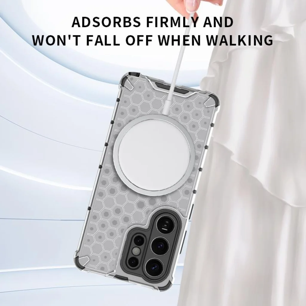 Védje Samsung Galaxy S26 Ultra készülékét a stílus, a funkcionalitás és a páratlan védelem tökéletes ötvözetével! Ez a méhsejt mintás, mágnesgyűrűs ütésálló telefontok, elegáns füst áttetsző fekete színben, nemcsak kiváló védelmet biztosít, hanem modern megjelenést és kényelmes használatot is kínál. Készüléke a legkeményebb kihívásokkal szemben is biztonságban lesz, miközben Ön élvezheti a beépített mágnesgyűrű nyújtotta előnyöket.