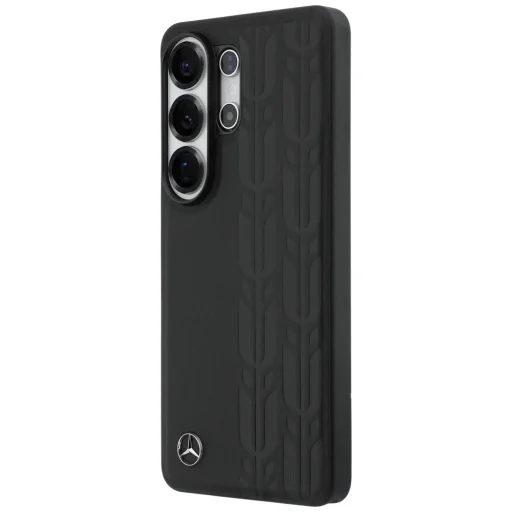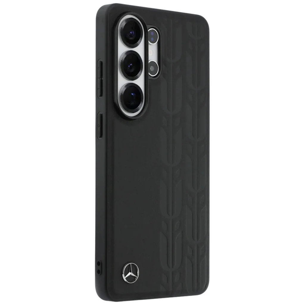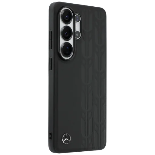 A tok matt fekete felülete modern és időtlen megjelenést kölcsönöz, amelyet a hátlapon dombornyomott, ikonikus babérlevél (Laurel Leaves) minta tesz egyedivé. Ez a stílusos textúra nemcsak vizuálisan vonzó, hanem extra tapadást is biztosít, megakadályozva a telefon kicsúszását a kezéből. Az alsó részén elhelyezkedő diszkrét, krómozott Mercedes-Benz csillag logó elegánsan utal a márka presztízsére és hitelességére, igazolva, hogy egy minőségi, eredeti termékről van szó.