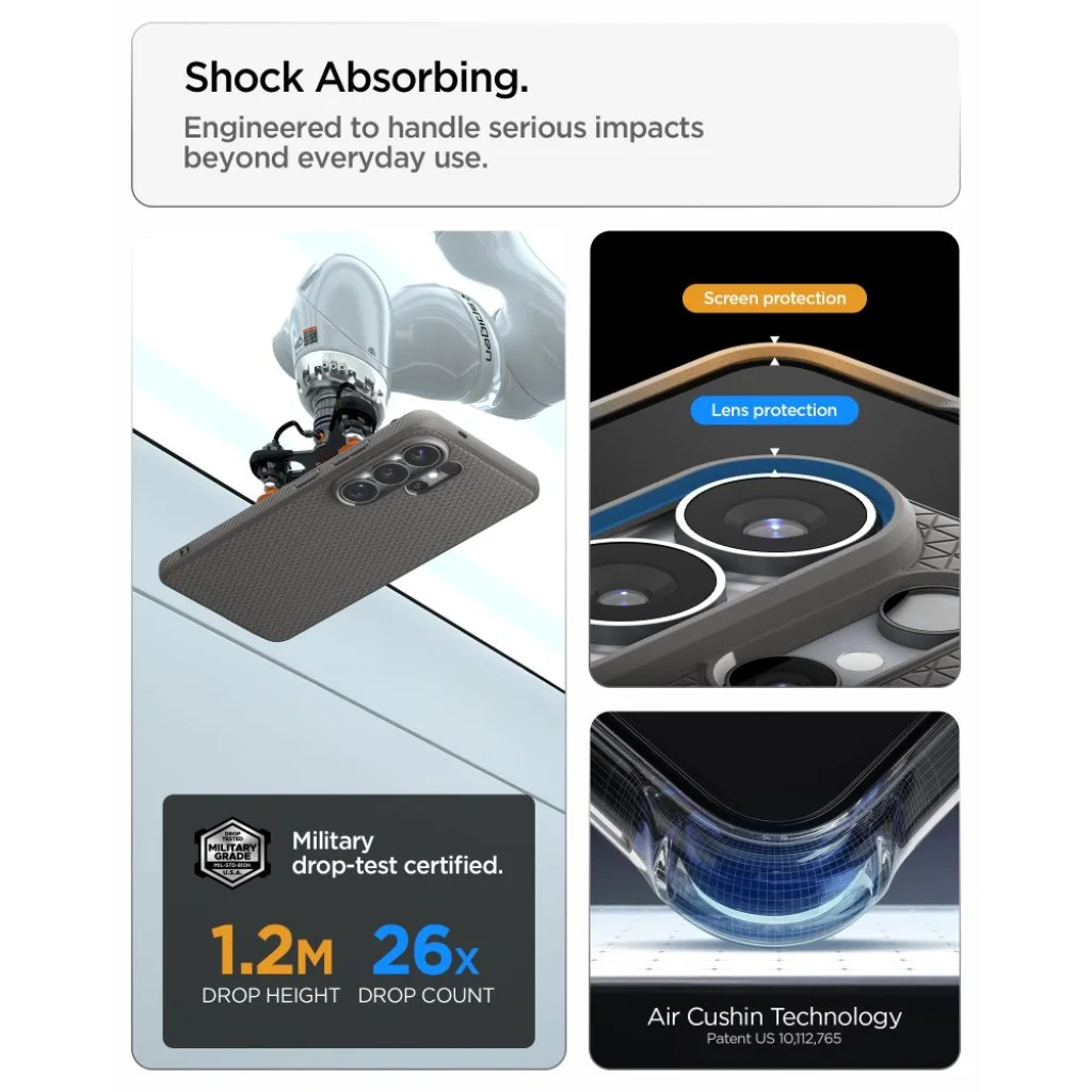 A Liquid Air MagFit a védelem terén is élen jár. Tartós, de rugalmas TPU anyagból készült, amely könnyedén felhelyezhető és eltávolítható. A sarkokban alkalmazott Air Cushion technológia™ légzsákokat hoz létre, amelyek hatékonyan elnyelik az ütéseket és megvédik a telefont esés esetén. Ezt a tokot katonai szintű ejtésteszttel is tanúsították, ami azt jelenti, hogy 1.2 méter magasságból akár 26 leejtést is kiáll. Az emelt élek a képernyő és a kamera körül további védelmet nyújtanak a karcolások és sérülések ellen, így a lencsék és a kijelző is biztonságban van.