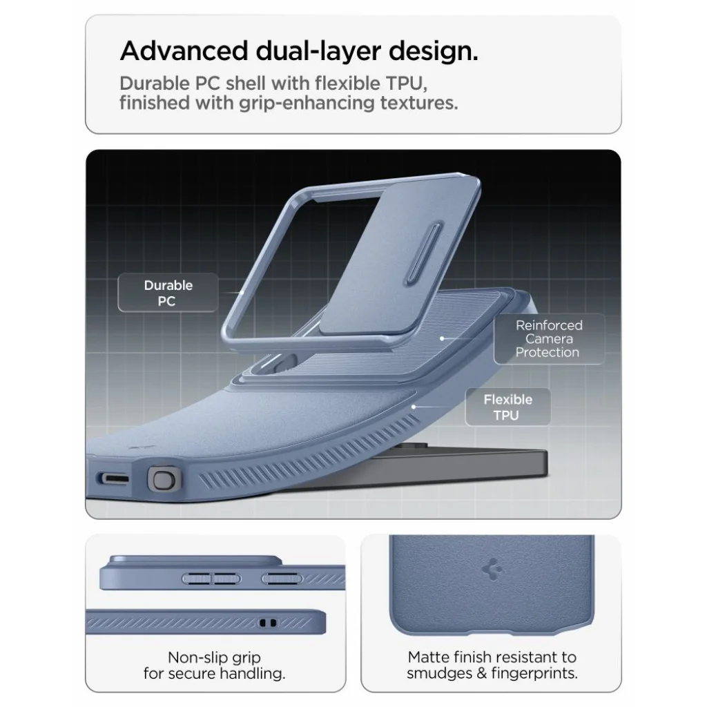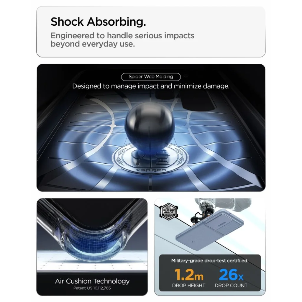- Military-grade védelem Air Cushion technológiával: Az Spigen szabadalmaztatott Air Cushion technológiája a tok sarkaiban elnyeli az ütéseket esés esetén, hatékonyan védve a telefont a kritikus pontokon. A tokot 1,2 méteres magasságból 26 alkalommal tesztelték, és megfelelt a MIL-STD 810G-516.6 katonai szabványnak, garantálva a kiemelkedő ütésállóságot. A belső pókháló mintázat (Spider Web Molding) tovább fokozza az ütéscsillapítást és minimalizálja a károkat.