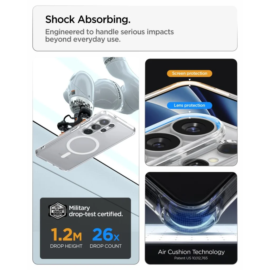 - Spigen DuraClear Anti-Yellowing technológia: A speciális DuraClear technológiának köszönhetően a tok 1.7x tovább megőrzi átlátszóságát, mint a hagyományos átlátszó tokok. A 240 órás UV-expozíciós tesztek során 170%-kal jobb eredményt ért el a sárgulás elleni védelemben, így telefonja hosszú távon is ragyogóan látható marad, megőrizve eredeti designját.