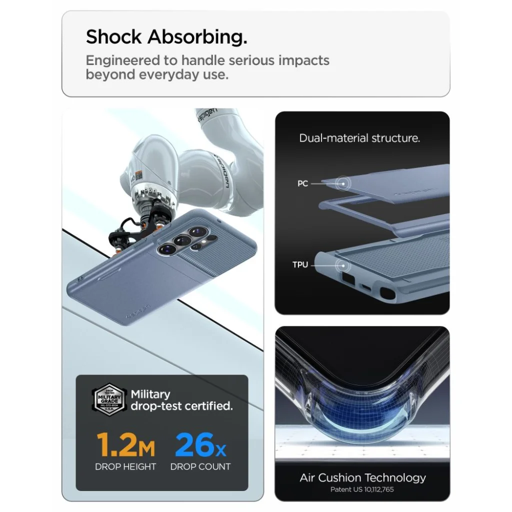 A Spigen Slim Armor CS egy hibrid tok, amely az előrehaladott védelmet egy praktikus rejtett kártyatartóval egyesíti. A kétszintű konstrukció kemény polikarbonátból és rugalmas TPU-ból biztosítja a katonai szintű tanúsított védelmet, hatékonyan megóvva a telefont a véletlen leejtések során bekövetkező sérülésektől. A vékony profilnak köszönhetően a tok nem növeli feleslegesen az eszköz méretét, megőrizve annak hordozhatóságát a mindennapi használat során.