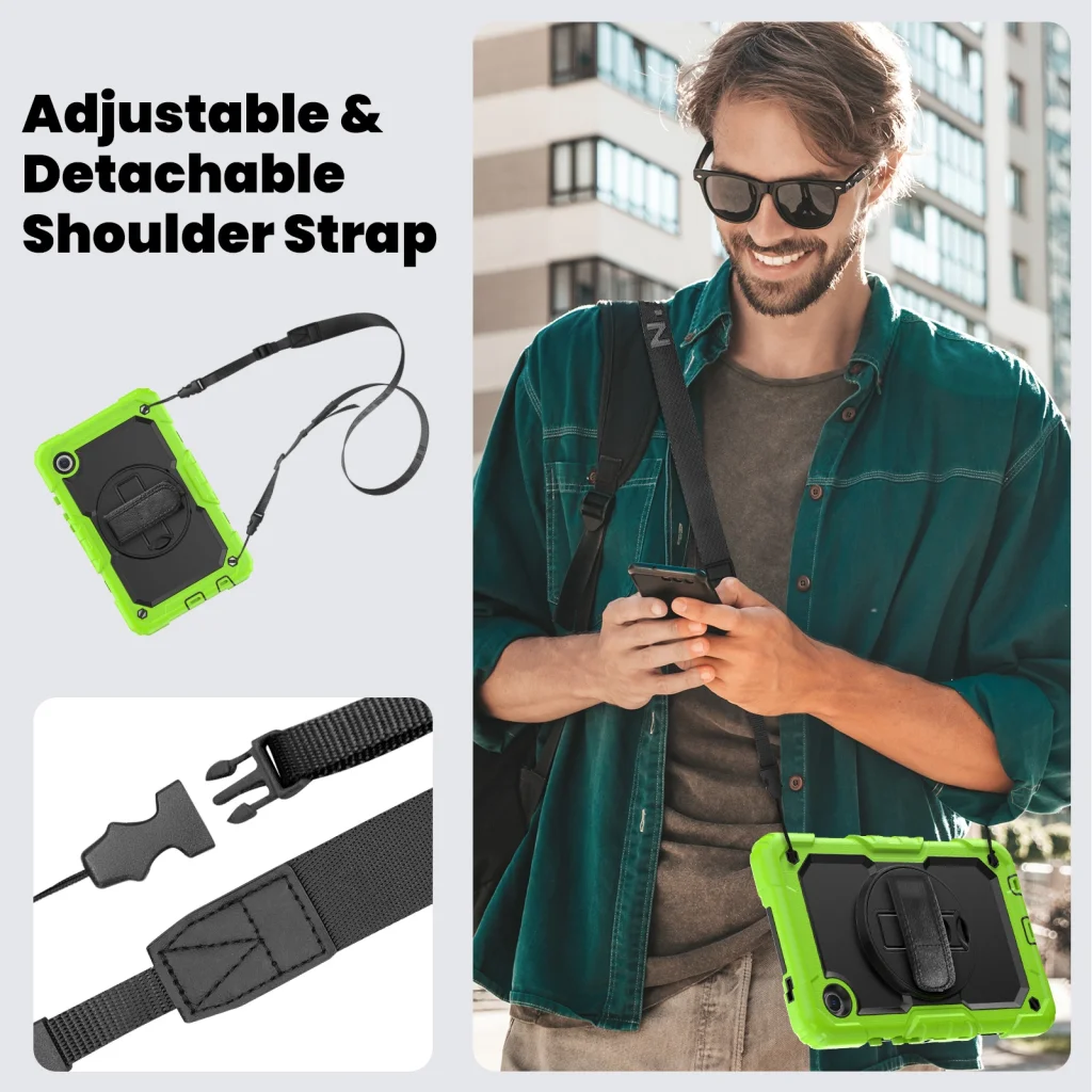 - Állítható és levehető vállpánt: A mellékelt vállpánttal kényelmesen hordozhatja tabletjét, így a kezei szabadon maradnak más tevékenységekhez. Ideális utazáshoz, munkához vagy szabadtéri kalandokhoz.