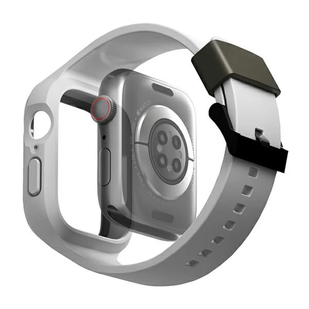 UNIQ MONOS - Egy darabból álló szíj beépített védőtokkal, amelyet a maximális kényelem és az egyszerű felszerelés érdekében terveztek. A szíj rugalmas termoplasztikus poliuretánból készült, amely tartós polikarbonátból készült emelt kerettel van integrálva a jobb védelem érdekében. A szíj precízen van kidolgozva, hogy teljes hozzáférést biztosítson az összes órafunkcióhoz. A szíj hossza állítható, mivel elegendő számú lyuk van biztosítva, és a csat rozsdamentes acélból készült - mindez a tökéletes csuklóra illeszkedés érdekében. Gyűjtemény: Monos, Típus: Szíj tokkal, Szín: Szürke, Hosszúság: 16-22cm, Kompatibilitás: Apple Watch 4/5/6/7/8/9/SE/SE2/SE3 44/45mm.