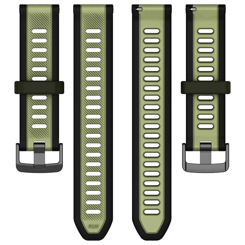 A kiváló minőségű szilikonból készült szíj rendkívül kényelmes viseletet biztosít egész nap, még intenzív edzés során is. Anyaga bőrbarát, rugalmas, és ellenáll az izzadtságnak, így ideális választás aktív életmódot élők számára. A belső khaki és külső fekete színkombináció, valamint a bordázott, texturált felület modern és dinamikus megjelenést kölcsönöz, emellett elősegíti a bőr szellőzését.