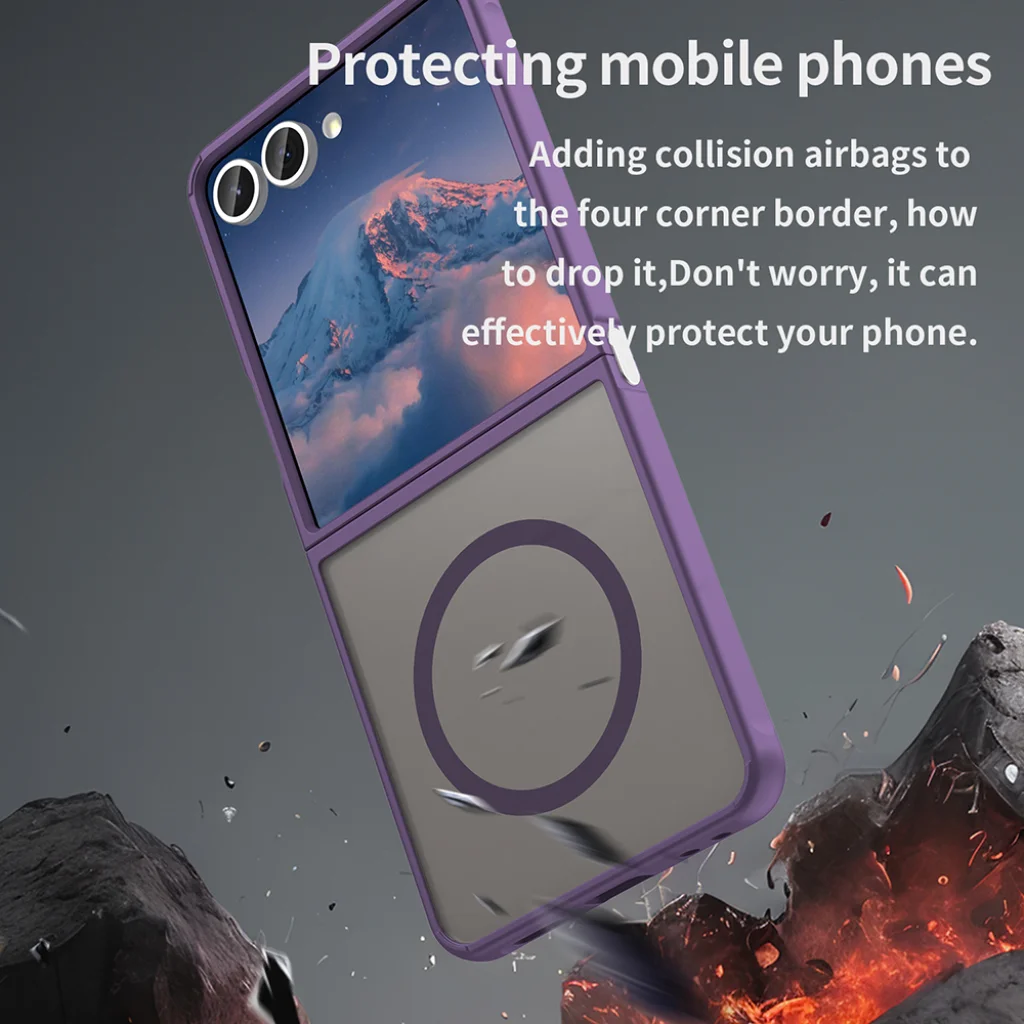 A Techsuit HaloFrost II tokot kifejezetten a Samsung Galaxy Z Flip7 egyedi, összecsukható formavilágához tervezték, garantálva a tökéletes illeszkedést és a zavartalan funkcionalitást. A kétrészes kialakítás precízen követi a telefon vonalait, miközben a matt lila keret elegáns megjelenést kölcsönöz.
